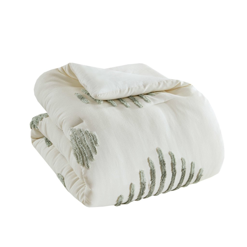 DescriptionThe INK+IVY Tahli comforter set features a modern tufted chenille design on textured fabric that adds contrast and dimension to the bed, creating a stunning visual effect. This cotton blend chenille comforter will transform your bedroom into a chic space, while 2 coordinating shams complete the look of this contemporary bedding ensemble. The hypoallergenic polyester filling contains no allergens and is treated to be dustproof so you can sleep comfortably. This comforter set is also OEKO-TEX certified and is machine washable for easy care.Product DetailsKing/Cal King1 Comforter:106"W x 94"L2 King Shams:20"W x 36"L (2)MaterialComforter/Sham: 64% cotton 36% polyester chenille tufted face, 100% cotton solid backFill: 100% polyester
