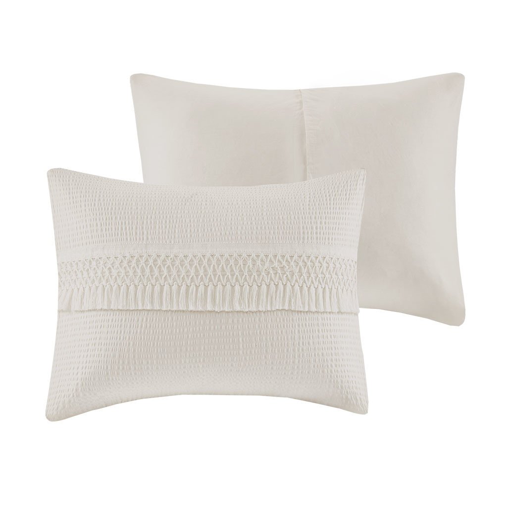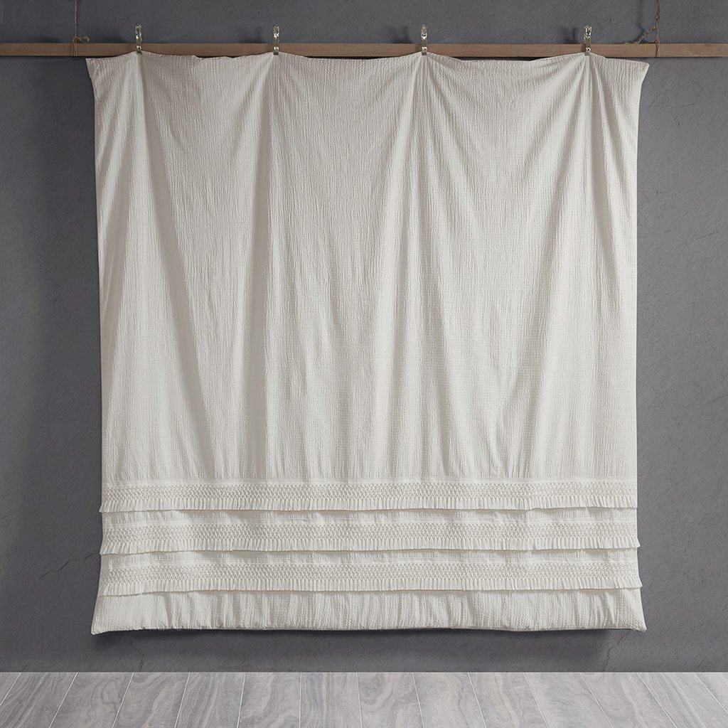 DescriptionRestyle your bedroom with shabby chic allure of the Madison Park Amaya 3 Piece Cotton Seersucker Comforter Set. The ivory seersucker comforter is made from 100% cotton and features decorative tassel trims for a globally inspired look. Also included are two matching shams that mirror the unique design of the comforter. Machine washable for easy care, this cotton seersucker comforter set brings a globally inspired style with a soft allure to your bedroom décor. This bedding set is also OEKO-TEX certified, meaning it does not contain any harmful substances or chemicals to ensure quality comfort and wellness.Product DetailsKing/Cal King1 Comforter:104"W x 92"L2 King Shams:20"W x 36"L (2)MaterialComforter/Sham: 100% cotton seersucker with tassels, 100% cotton reverse, 100% poly fill