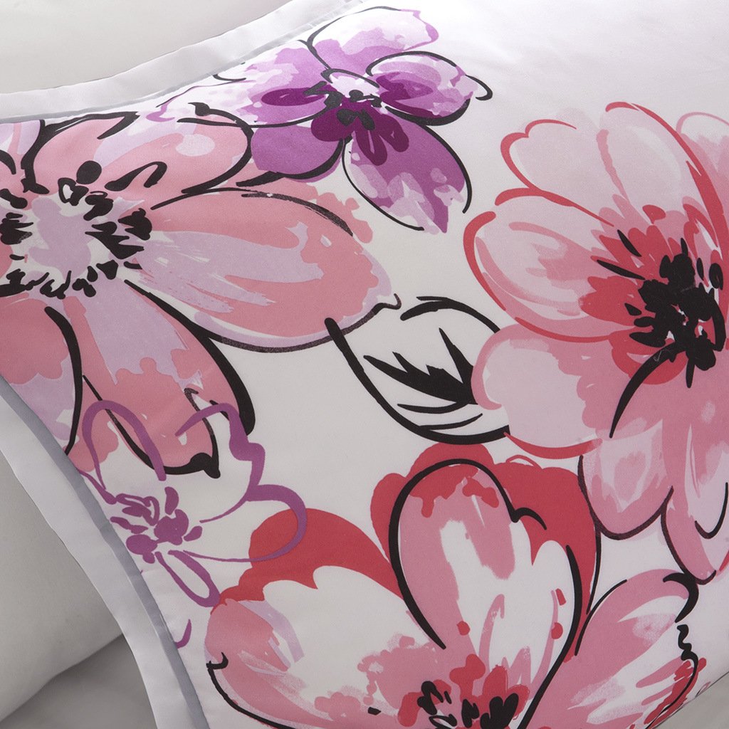 DescriptionBring a bright and cheerful update to your bedroom with the Intelligent Design Olivia Comforter Set. The comforter and shams (1 in Twin/TwinXL) flaunts bright colors and an asymmetrical floral print to invigorate your space with striking style. A solid grey reverse complements the top of the bed. The 2 decorative pillows feature floral embroidery and fabric manipulation, adding extra dimension to the top of bed. This bedding set uses an antimicrobial treatment that provides built-in freshness protection, reducing the growth of odor causing bacteria to keep fabric lasting longer.Product DetailsKing/Cal King1 Comforter:104"W x 90"L2 King Shams:20"W x 36"L + 2"D (2)1 Decorative Pillow:12"W x 16"L1 Decorative Pillow:16"W x 16"LMaterialComforter/Sham: 100% polyester peach skin printed fabric, 100% polyester brushed fabric reverse, 200g polyester fillPillow: polyester cover and polyester fill