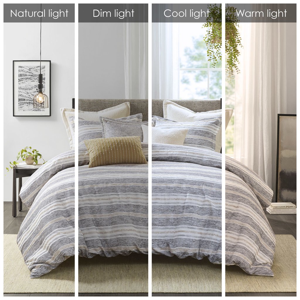 DescriptionThe Madison Park Signature Oasis oversized duvet-style comforter features a chenille jacquard stripe design in charcoal, dark golden yellow, and ivory for a casual, textured look. The bedding set includes 2 matching shams and 2 boucle Euro shams (3 in King size) that coordinate beautifully with the comforter. Plus, 3 decorative pillows with unique piping and embroidered details add the finishing touches, and have removable covers with hidden zippers for easy cleaning. This comforter uses a removable overfilled insert that is secured by inner ties and a hidden button closure, which provides no visible bartacking lines on top of the bed to create a smooth, clean look. The hypoallergenic polyester filling in the removable insert contains no allergens and is treated to be dustproof so you can sleep comfortably. Dry clean comforter cover only and machine wash comforter filler.Product DetailsFull/Queen1 Comforter:92"W x 96"L2 Standard Shams:20"W x 26"L + 1.5"D (2)2 Euro Shams:26"W x 26"L + 1.5"D (2)1 Throw Pillow:20"W x 20"L1 Throw Pillow:18"W x 18"L1 Throw Pillow:14"W x 20"LMaterialComforter/Sham: 60% cotton, 40% polyester, jacquard Reverse: 100% cotton solid Filling: 100% polyester