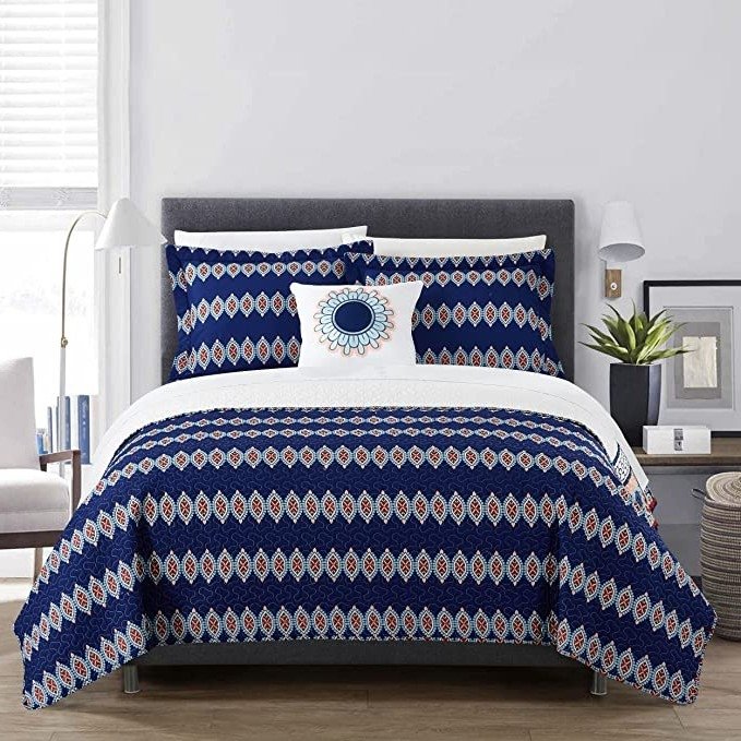 Relax in sift luxury with this 4 Piece 100% Cotton Blue White Boho Geometric Reversible Quilt Set - Queen. This quilt cover is made with premium quality fine combed super soft prewashed 100% cotton 200 thread count. This quilt is filled with cotton (80%) and synthetic down alternative filling (20%). The reversible quilt cover is perfect for spring, summer, or fall nights and southern states all year round. The set is made with strict quality control and comes with a queen size quilt cover, 2 shams and a decorative pillow.