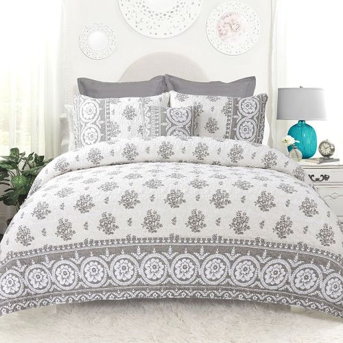 This King 4-Piece Reversible Floral Cotton Quilt Set with Decorative Pillow and 2 Shams will be a great addition to your home. This vintage inspired floral quilt is reversible and each side will add sophistication to your bedroom. One side offers white background with bouquets of flowers all over. This side has a top and bottom edge which matches the reverse side of the quilt which has a grey background with a horizontal linear medallion design.