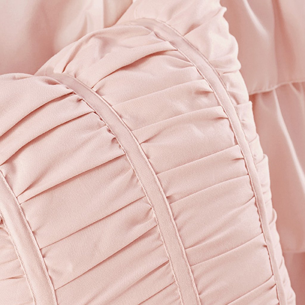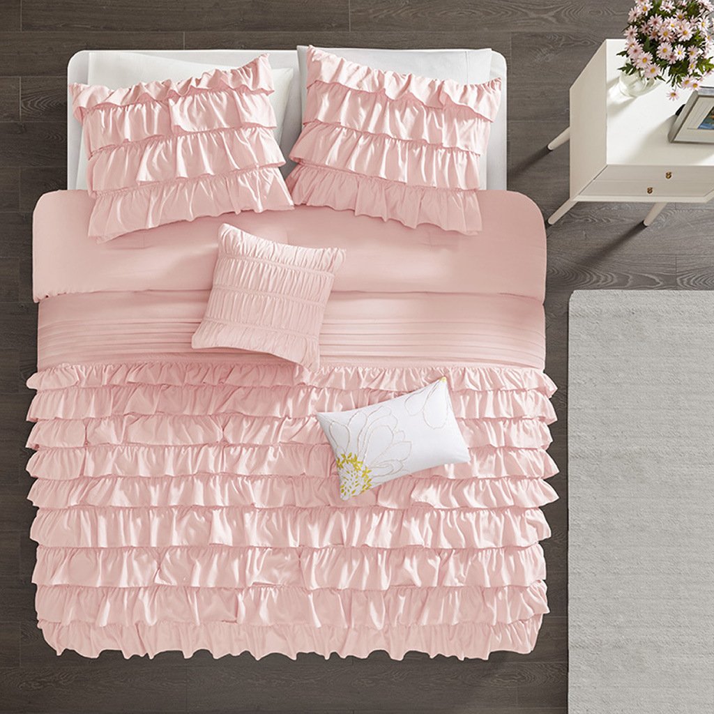 DescriptionThe Intelligent Design Waterfall Ruffled Comforter Set offers a graceful comfort to your bedroom decor. Beautiful flowing ruffles on the bottom half of the blush comforter add charming appeal to the comforter and 2 coordinating shams (1 for Twin/TwinXL). A solid blush reverse creates a clean look, while two decorative pillows with fabric manipulation and embroidery provide a touch of casual elegance to the bedding set. Made from ultra-soft microfiber, this printed comforter set is machine washable for easy care. This bedding set uses an antimicrobial treatment that provides built-in freshness protection, reducing the growth of odor causing bacteria to keep fabric lasting longer.Product DetailsFull/Queen1 Comforter:90"W x 90"L2 Standard Shams:20"W x 26"L (2)1 Decorative Pillow:12"W x 18"L1 Decorative Pillow:16"W x 16"LMaterialComforter/Sham: 100% polyester solid 85gsm microfiber, with flowing ruffles, solid microfiber reverse, 200gram polyester fillingPillow: Brushed microfiber cover and polyester filling
