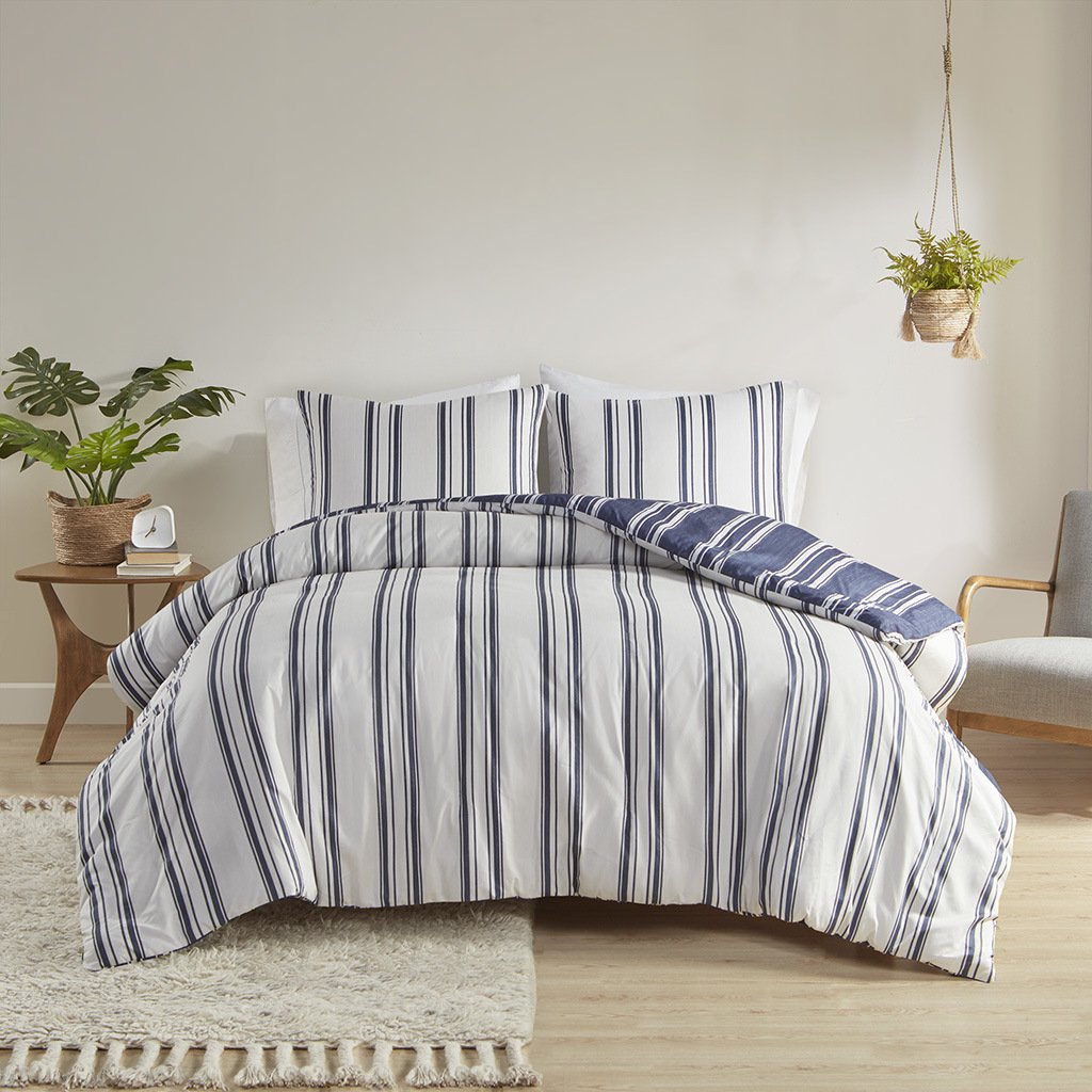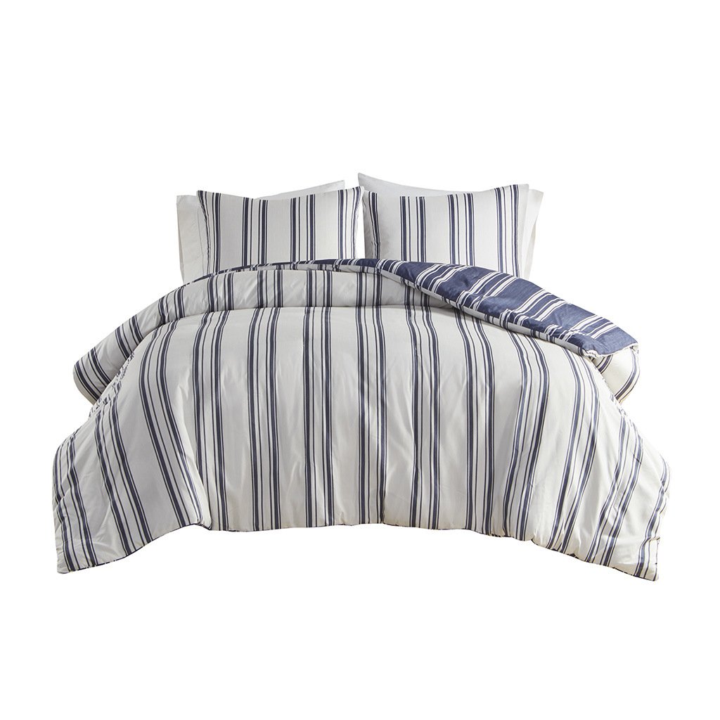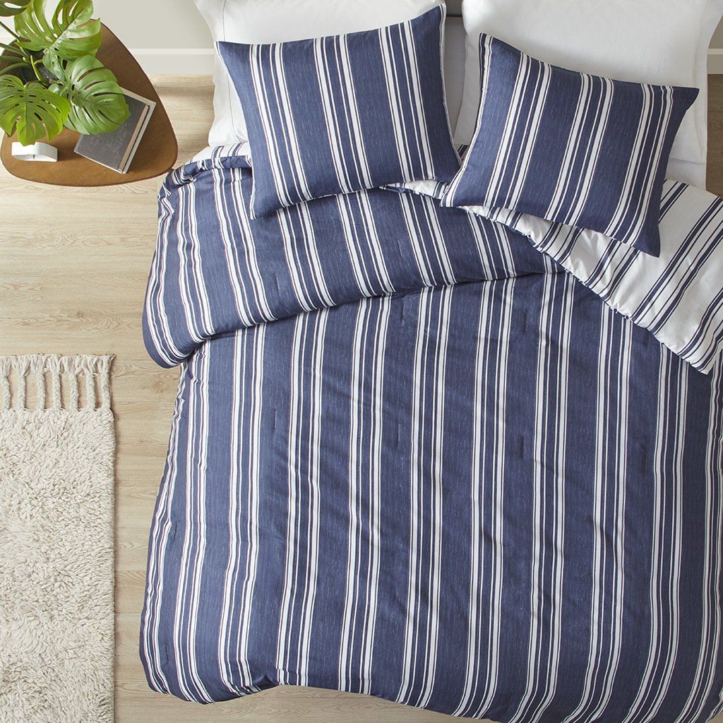 DescriptionCreate a casual farmhouse look in your bedroom with the Intelligent Design Cobi Striped Reversible Comforter Set. This reversible comforter and shams (1 in Twin/TwinXL) feature a striped print that flips the color scheme on the reverse to create two chic country styles. A stain release protection treatment helps to remove most stains during the wash cycle, while an antimicrobial treatment provides built-in freshness protection, reducing the growth of odor causing bacteria to keep fabric lasting longer. Machine washable for easy care, this striped bedding set offers a clean and cozy addition to your bedroom. Items in the set may come in a rolled or compressed packaging, which will need to be steam ironed before use to remove wrinkles.Product DetailsFull/Queen1 Comforter:90"W x 90"L2 Standard Shams:20"W x 26"L (2)MaterialComforter/Shams: 100% polyester soft brushed microfiber print face and back; yard down alternative fill. Fabric: Antimicrobial and stain release protection treatment