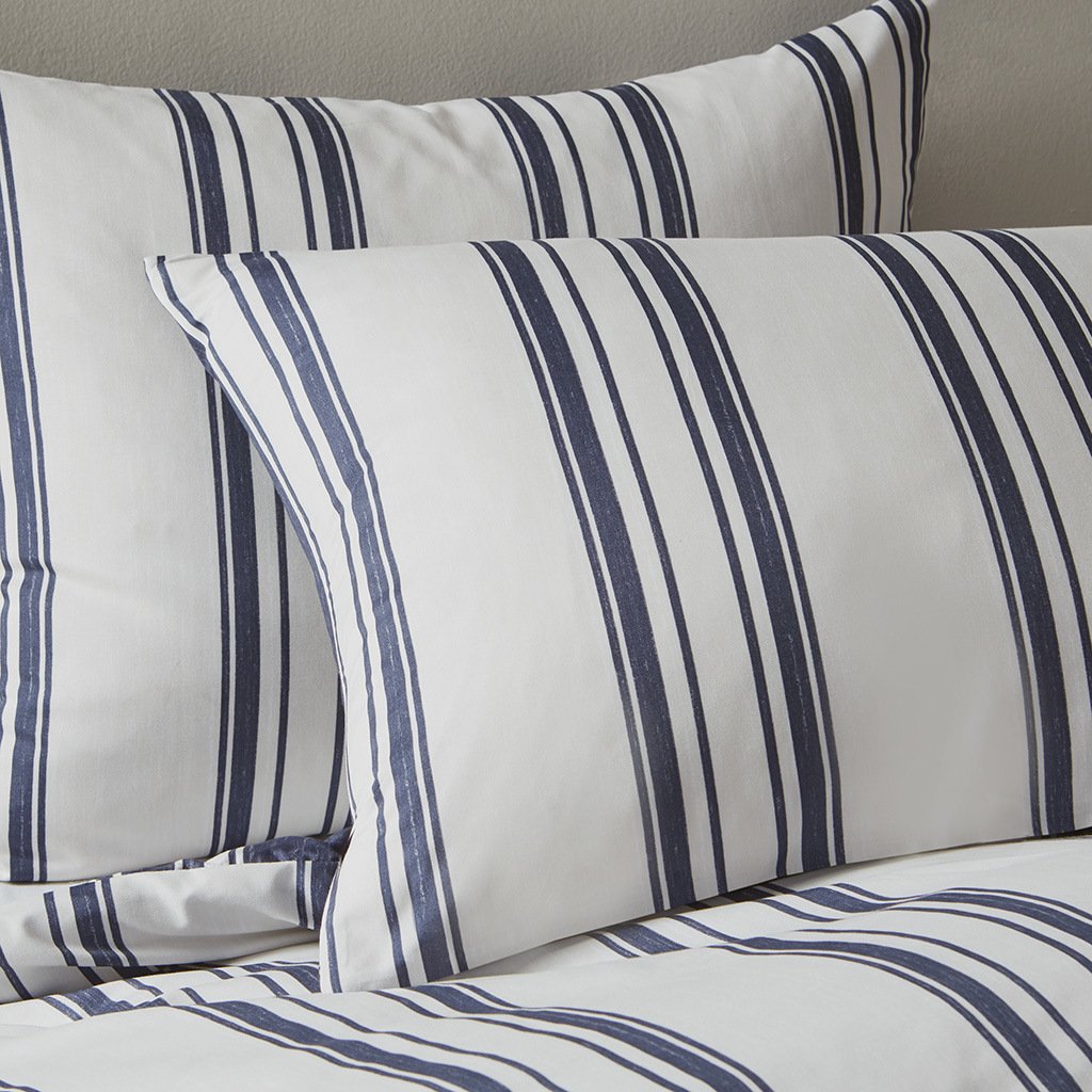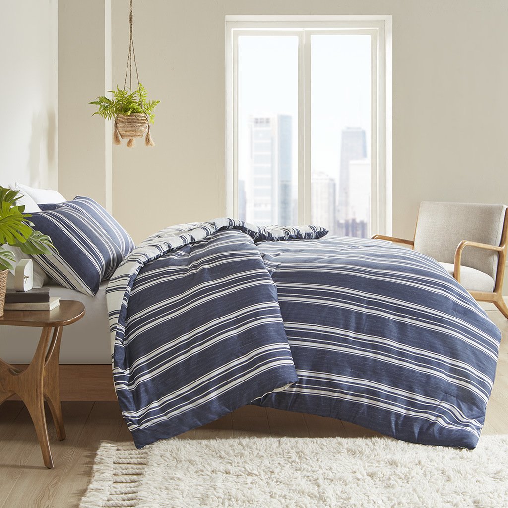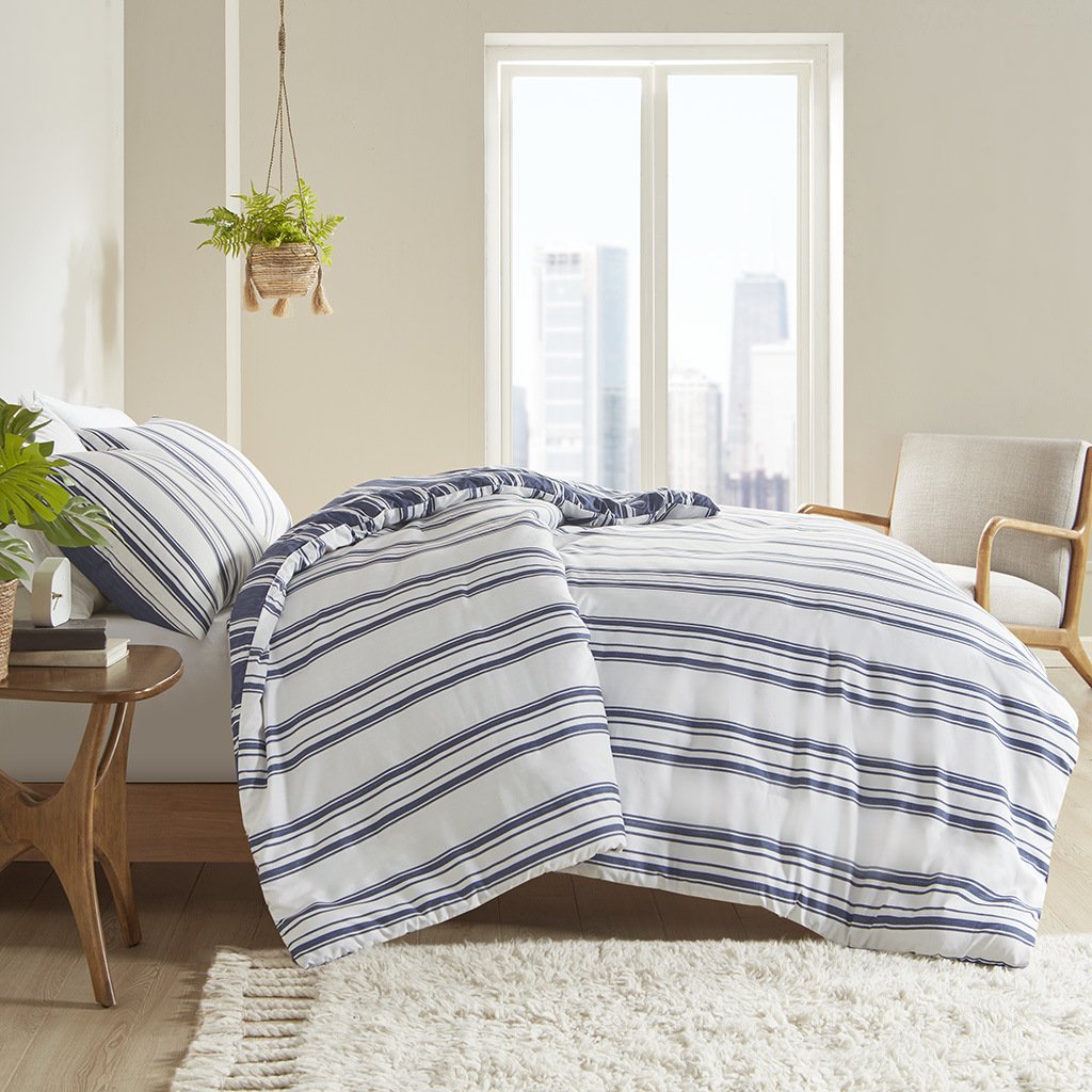 DescriptionCreate a casual farmhouse look in your bedroom with the Intelligent Design Cobi Striped Reversible Comforter Set. This reversible comforter and shams (1 in Twin/TwinXL) feature a striped print that flips the color scheme on the reverse to create two chic country styles. A stain release protection treatment helps to remove most stains during the wash cycle, while an antimicrobial treatment provides built-in freshness protection, reducing the growth of odor causing bacteria to keep fabric lasting longer. Machine washable for easy care, this striped bedding set offers a clean and cozy addition to your bedroom. Items in the set may come in a rolled or compressed packaging, which will need to be steam ironed before use to remove wrinkles.Product DetailsFull/Queen1 Comforter:90"W x 90"L2 Standard Shams:20"W x 26"L (2)MaterialComforter/Shams: 100% polyester soft brushed microfiber print face and back; yard down alternative fill. Fabric: Antimicrobial and stain release protection treatment