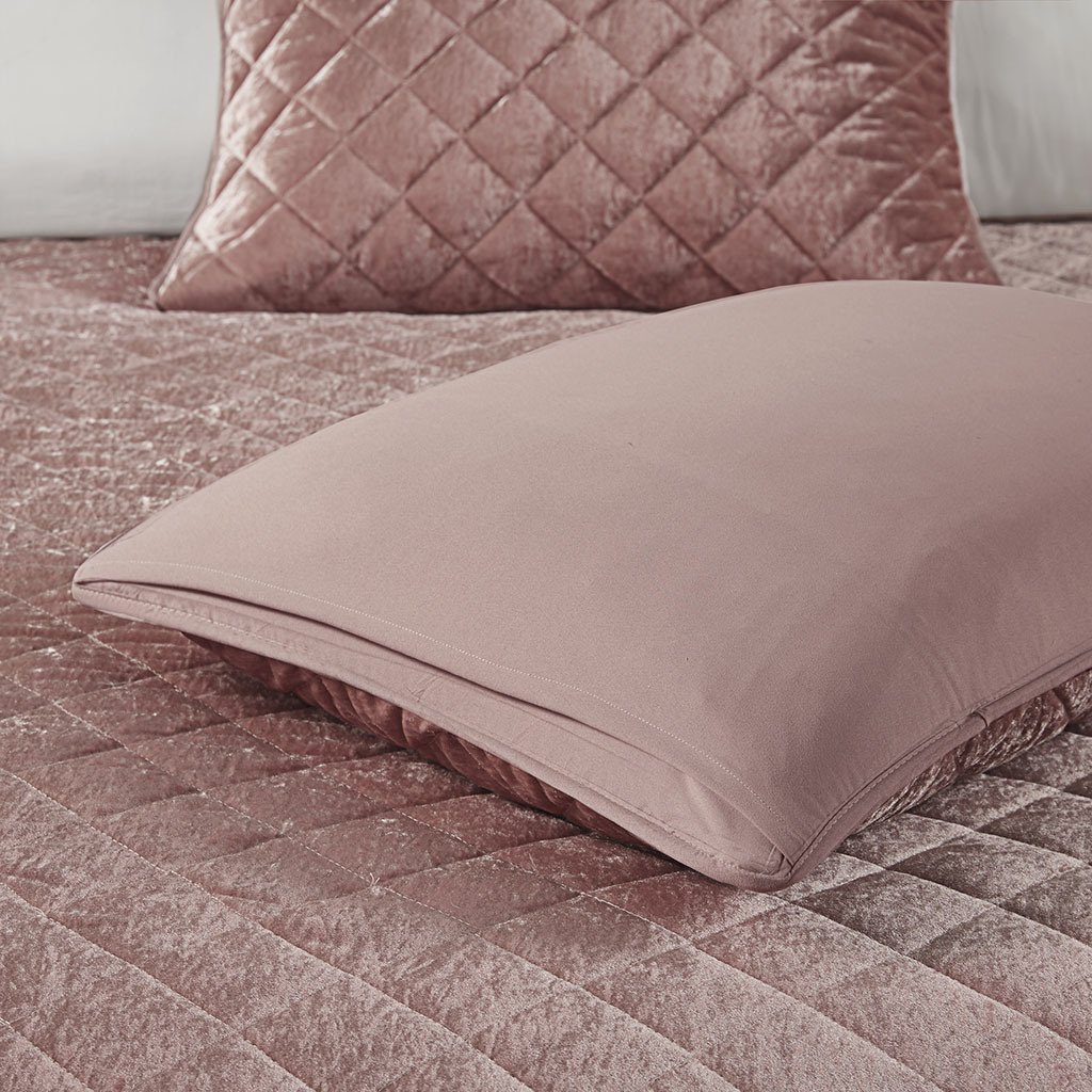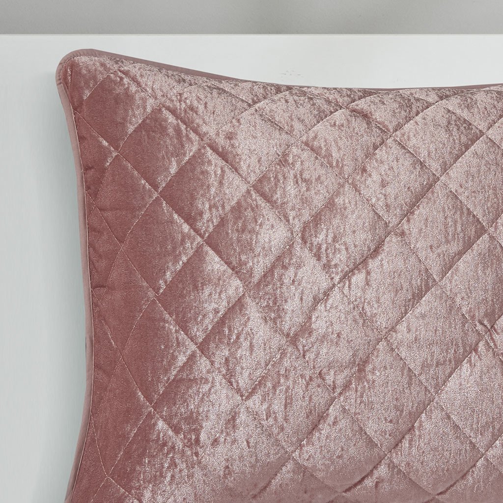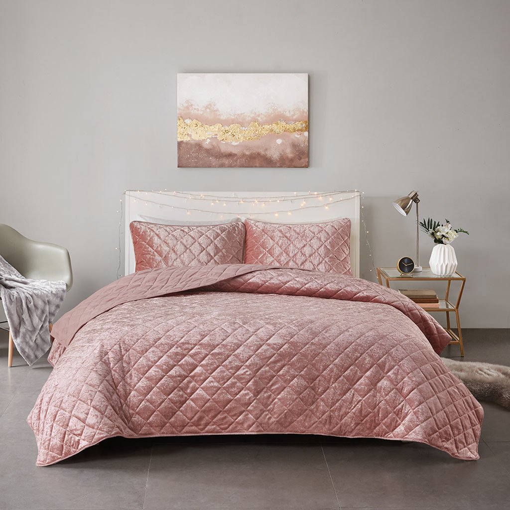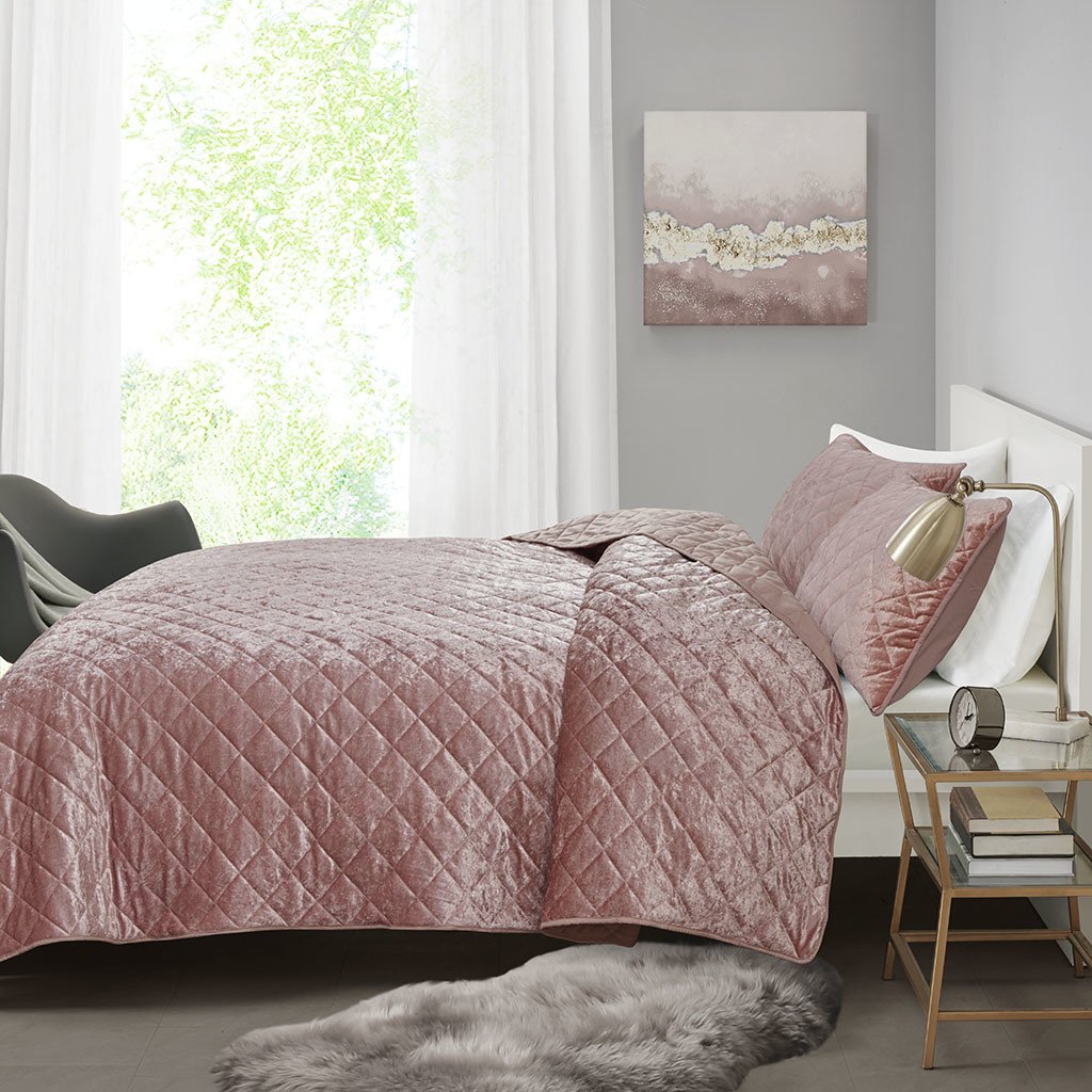 Luxurious crushed velvet quilt set features diamond quilting on top of the bed